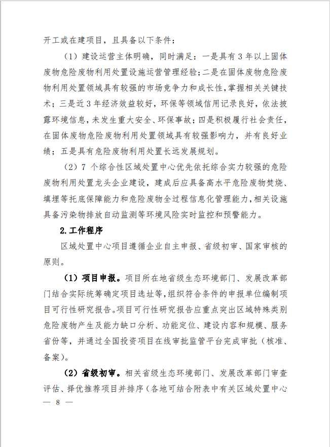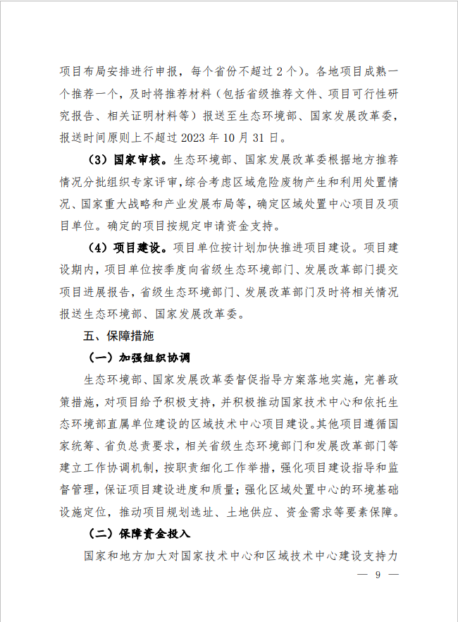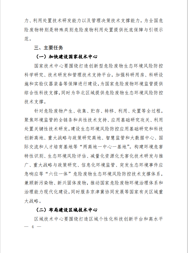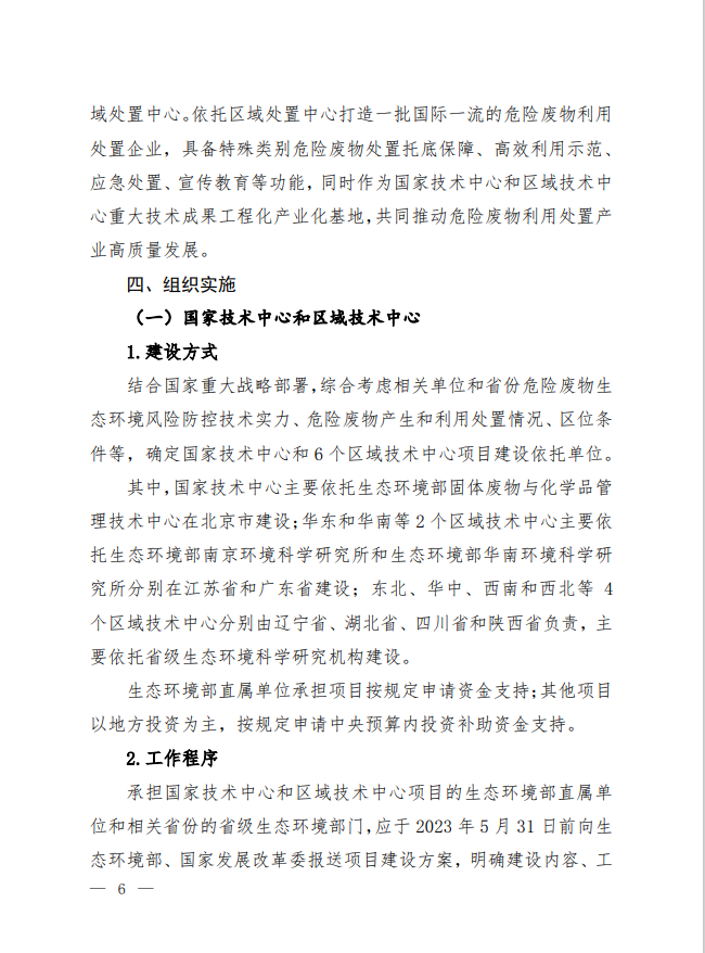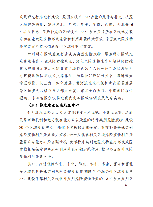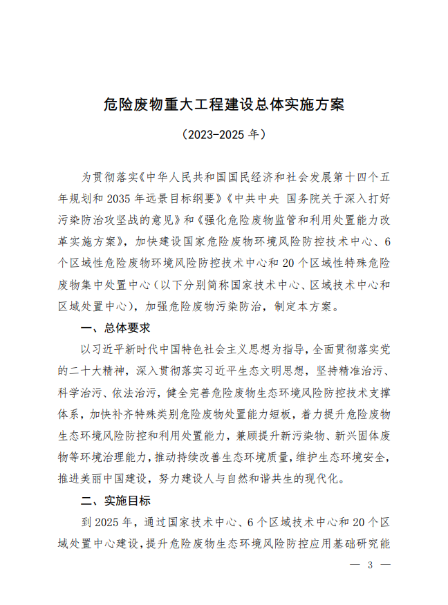 2023年5月8日,生态环境部、发展改革委印发关于《危险废物重大工程建设总体实施方案(2023-2025年)》的通知,通知要求,到2025年,通过国家技术中心、6个区域技术中心和20个区域处置中心建设,提升危险废物生态环境风险防控应用基础研究能力、利用处置技术研发能力以及管理决策技术支撑能力,为全国危险废物特别是特殊类别危险废物利用处置提供托底保障与引领示范。