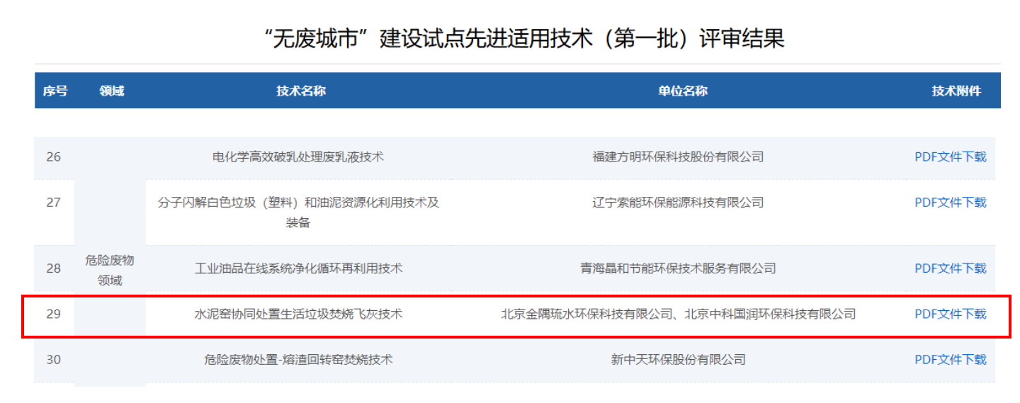 为贯彻落实《“无废城市”建设试点推进工作方案》,生态环境部针对“无废城市”试点建设技术需求,公开征集了一批先进适用技术。 通过专家评审,北京中科国润环保科技有限公司和北京金隅琉水环保科技有限公司(简称:中科国润和金隅琉水)研发、申报的“水泥窑协同处置生活垃圾焚烧飞灰技术”成功入选为“无废城市”试点建设需求技术中的“垃圾焚烧飞灰综合利用技术”!